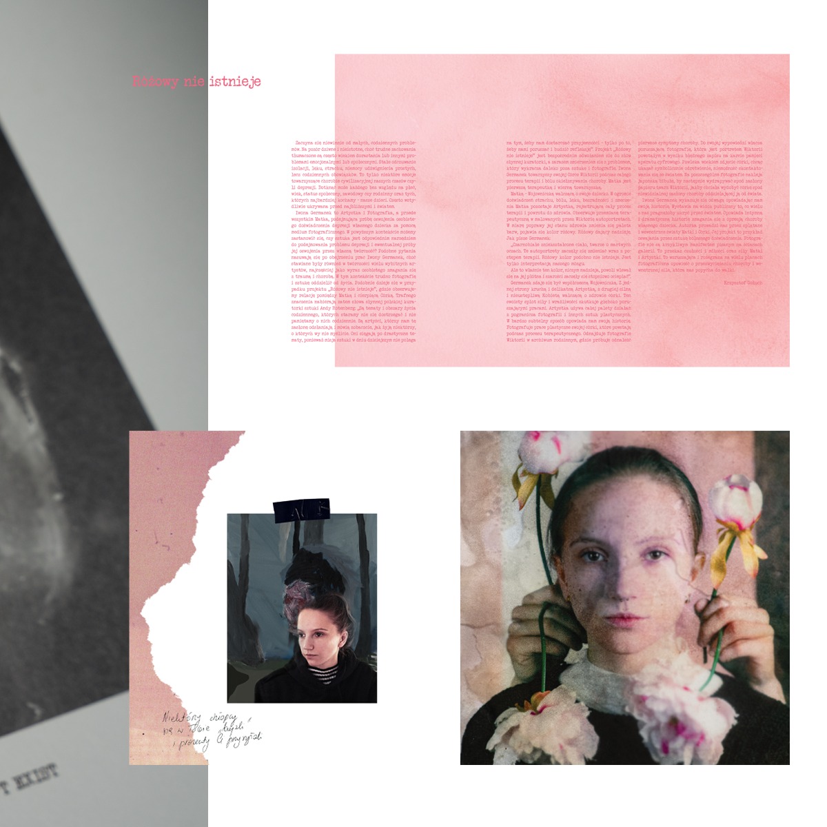 outstanding artists have explored the topic of personal struggle with trauma and illness. Their works as well as the project of Iwona Germanek prove that it is difficult to separate art from life. Pink Doesn’t Exist shows the relationship between a mother and her daughter struggling with depression.